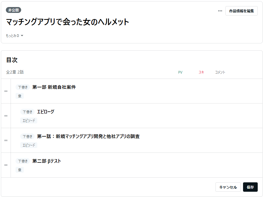 一方で、noteの場合は連載小説を書こうとすると、自分で目次ページを作るか、マガジンを目次代わりにする必要があります。