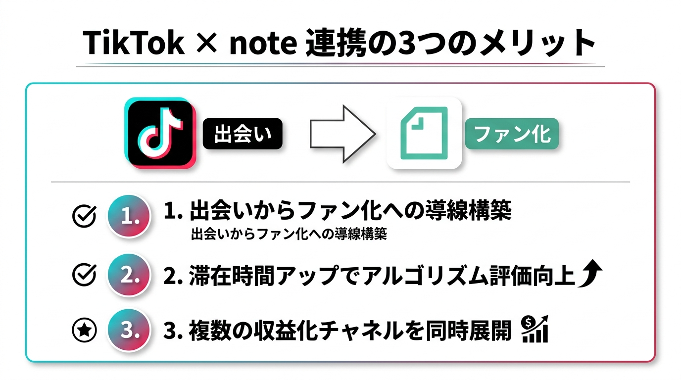 TikTokで興味を持ってもらい、noteで詳しく解説することで、単なる視聴者を「読者・ファン」へと育てることができます。